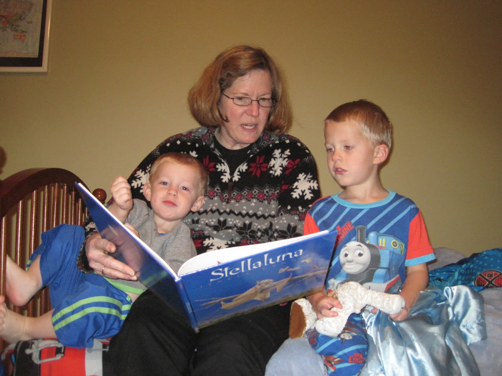 Every night Grandma read them books! (That is one of Austin's new words--he uses it to get out of going to bed because he knows I have a hard time denying him books!)